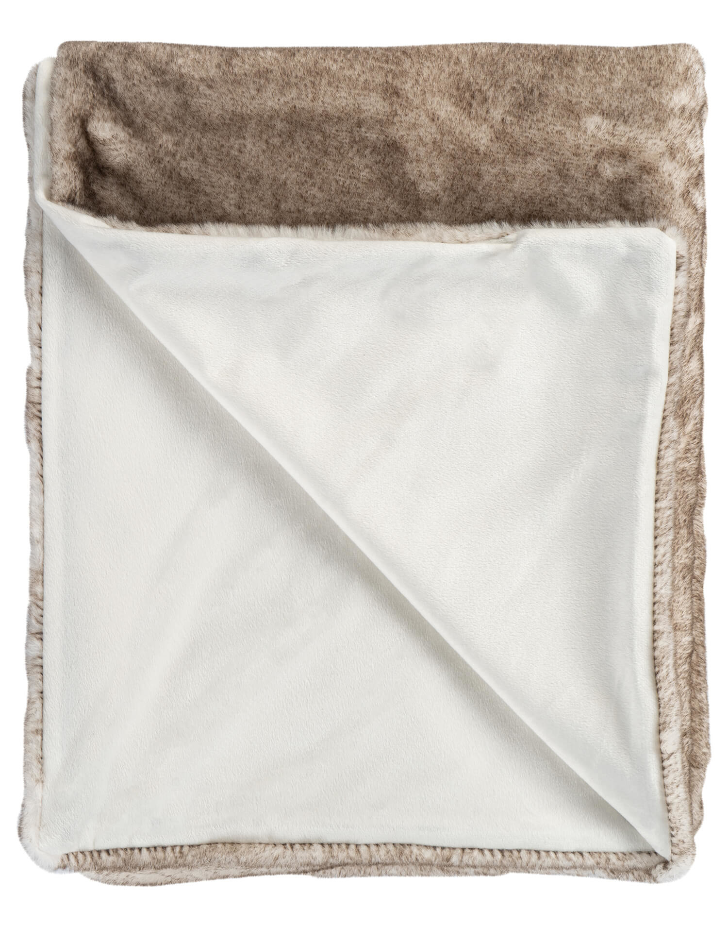 Onze dekens zijn gemaakt van twee lagen fleece. De bovenste laag is gemaakt van coral fleece. Deze polyester stof is dikker en heeft een hogere pool. Bij deze deken met vachtlook hebben de haren aan de bovenkant een ivoorwitte aanzet en een bruine kleur naar boven toe. De bovenkant voelt buitengewoon zacht aan.